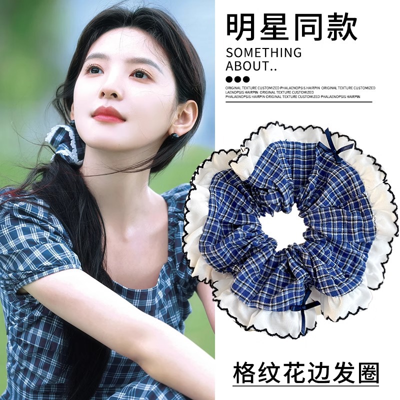 韓系の青い格子縞の蝶結びの大腸の髪の輪の女性のレースの団子の紐の馬尾の髪の紐の髪の花