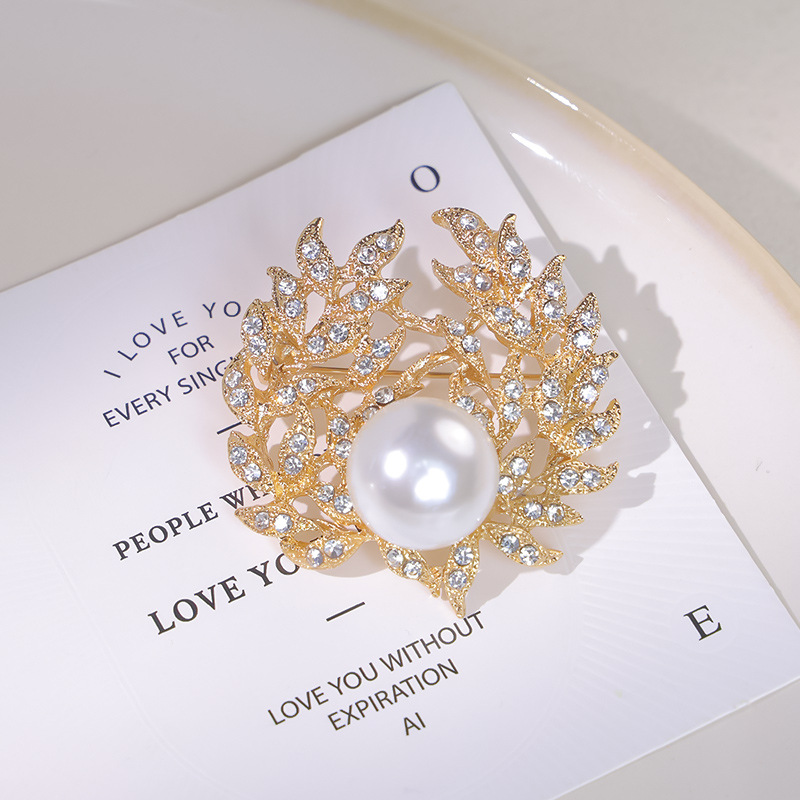 女性の真珠の木の葉の高級なブローチの金色のドリルのファッションの優雅な胸の花の固定の服の艶を防ぐピン