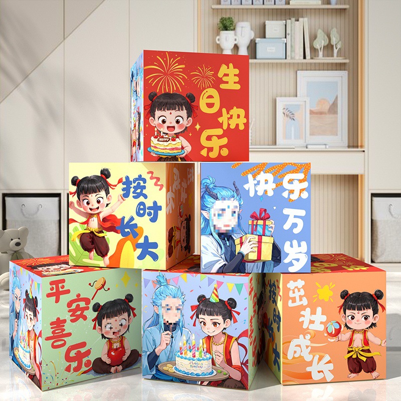子供の誕生日の装飾シーンのレイアウト、箱の山、ネザのテーマ、男の子と女の子の1歳の宴会の雰囲気、写真の小道具