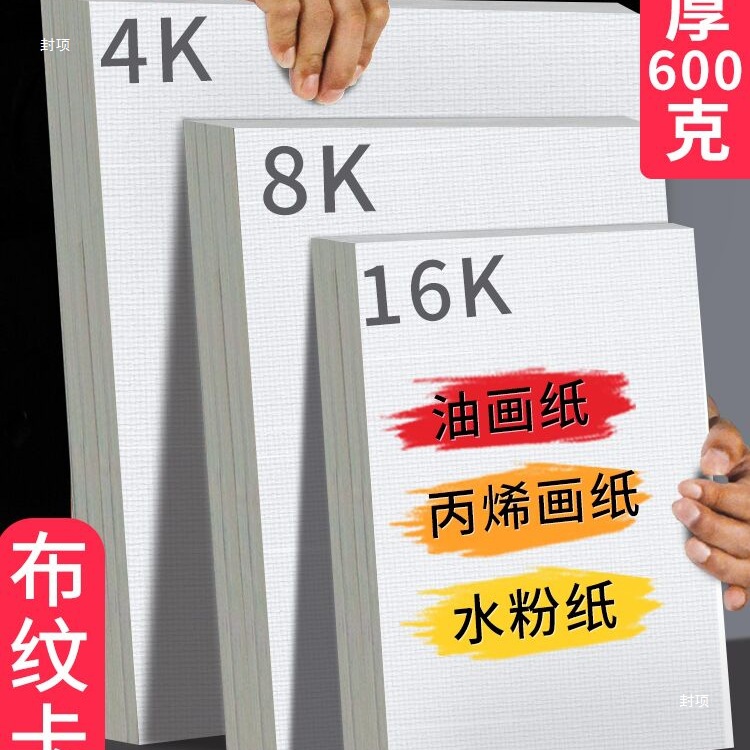 厚手のアクリル画用紙、布地加工ボール紙、アクリル絵の具用紙8枚、4枚のキャンバス、4枚の油絵用紙、16枚の油絵用紙