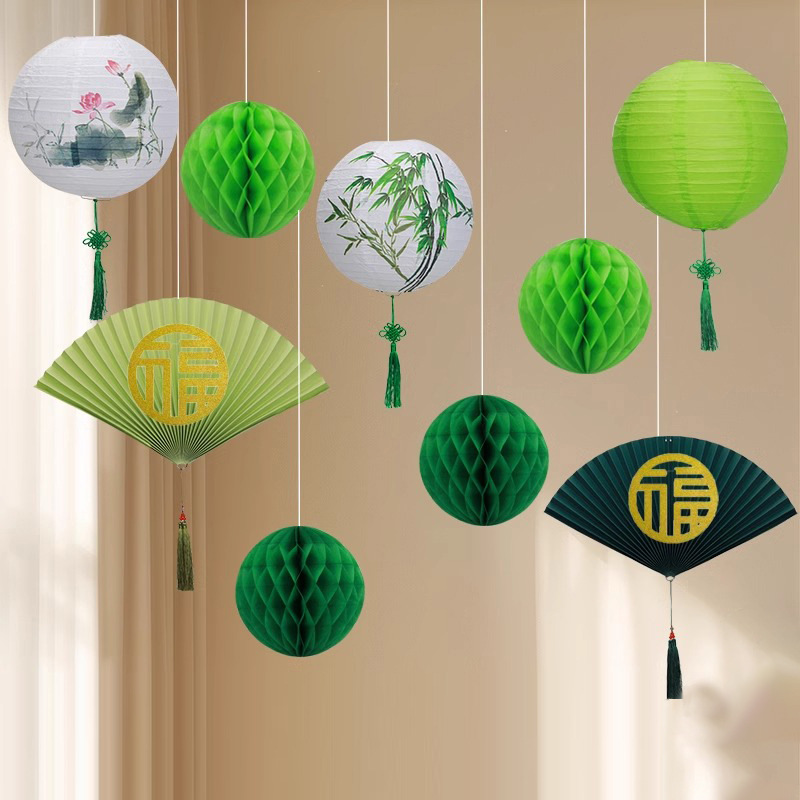 緑の中国風の紙扇子花窓天井ペンダント国民的トレンドペンダント紙扇子ランタン壁装飾中国風の小道具