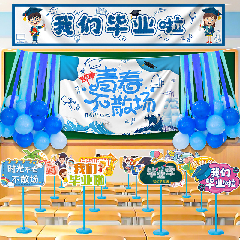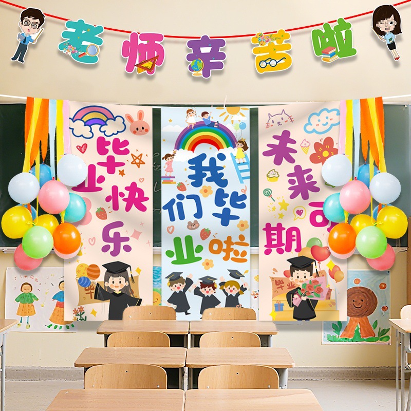卒業シーズンセレモニー教室シーンレイアウト吊り下げ布旗幼稚園小学校演台黒板装飾雰囲気風船
