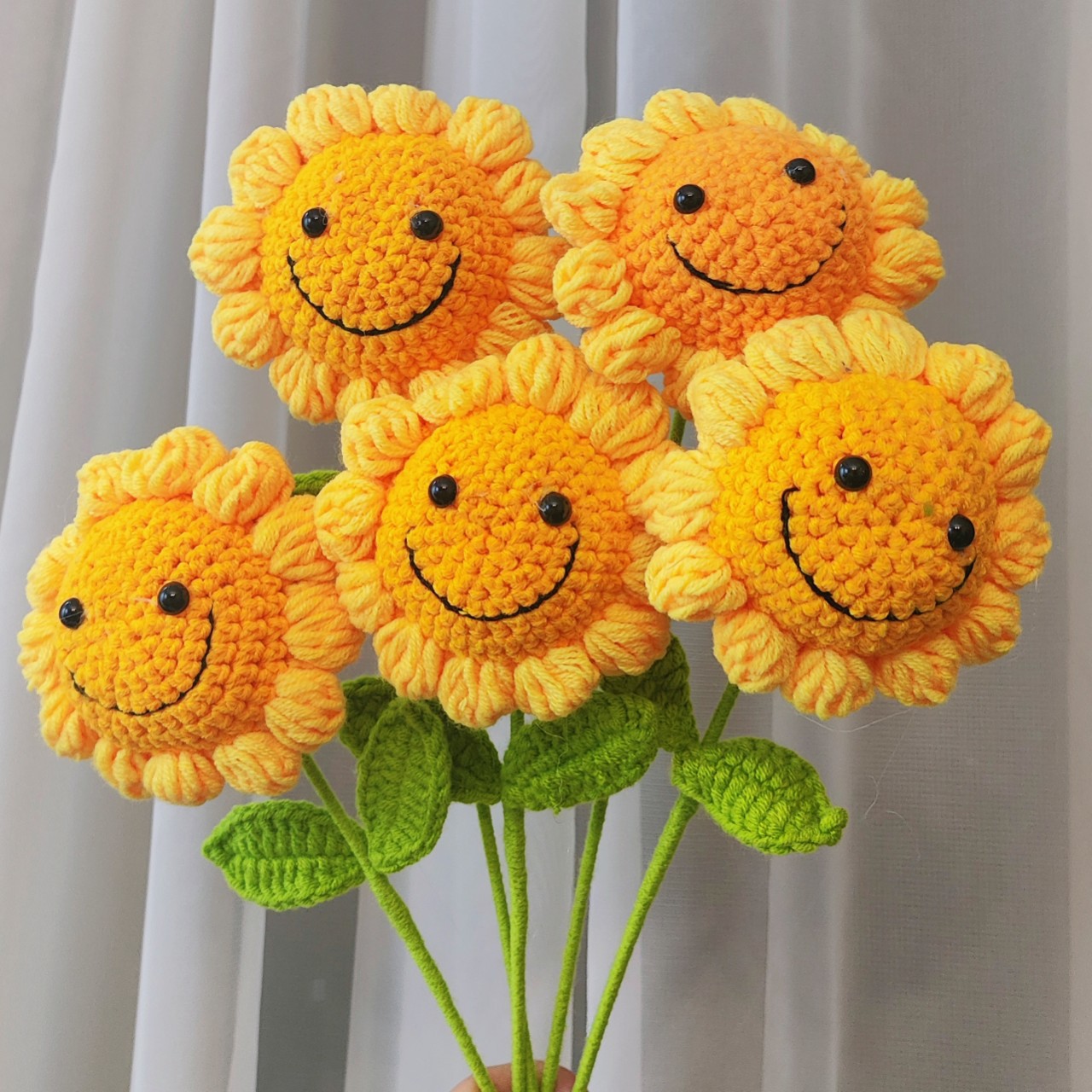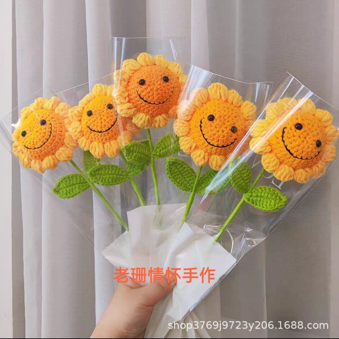 一気に一気に獲得、国境を越えた手作りのウールフック編みのスマイリーフェイスひまわりの花束、完成したクリエイティブな教師の日の卒業ギフト
