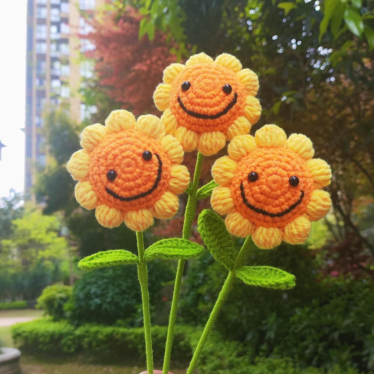 純手作り毛糸鉤編笑顔ヒマワリ太陽花一本花束完成品教師の日創造新年プレゼント