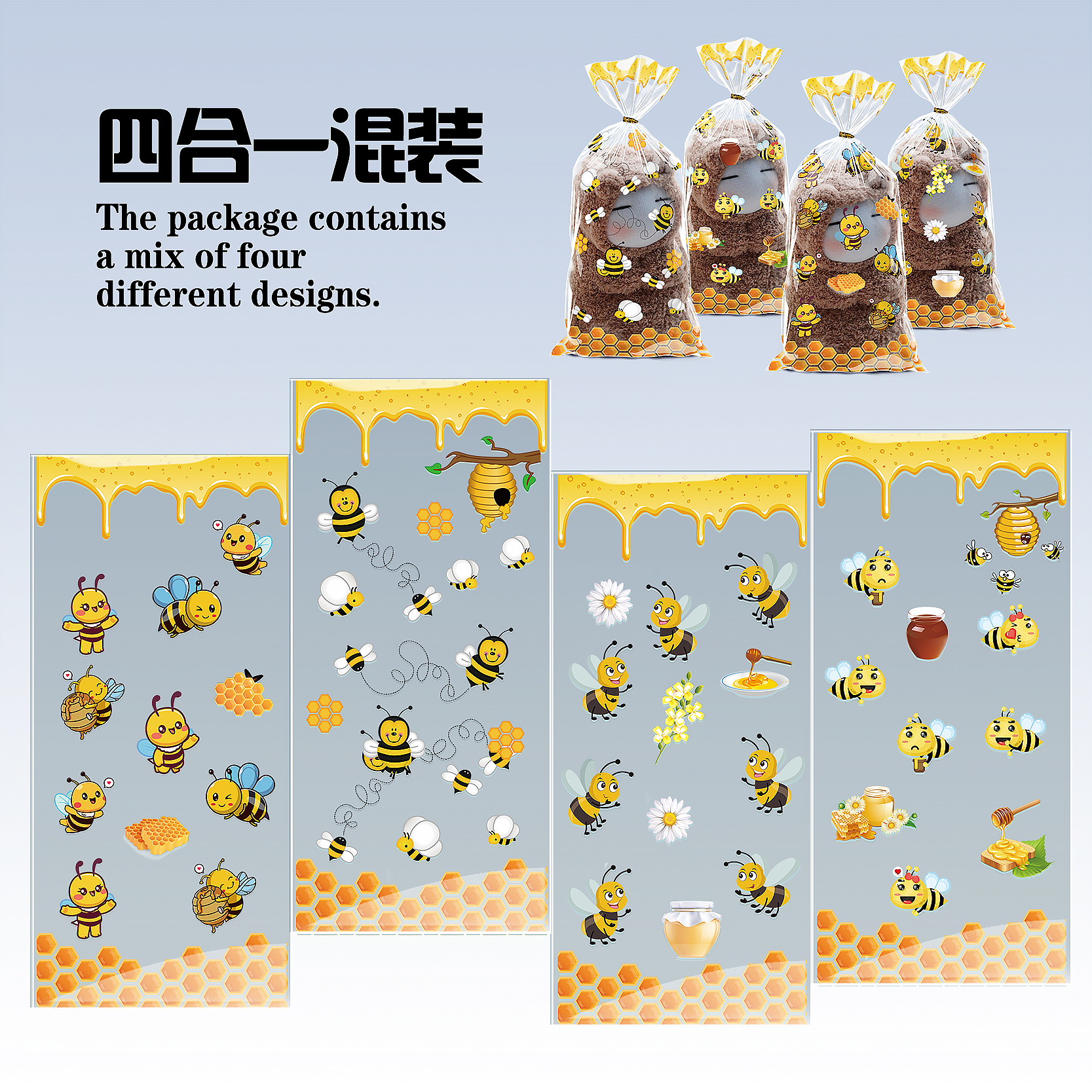 オリジナルアニメミツバチ平ポケットクロスボーダー英語ポップコーンガラス袋と糸を刺したプリント四合一混合