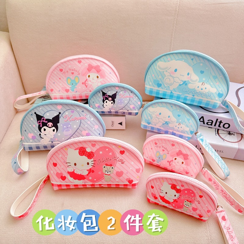 日系プリント化粧バッグ少女心便利バッグ2点セット小銭入れPU革半円形化粧バッグ