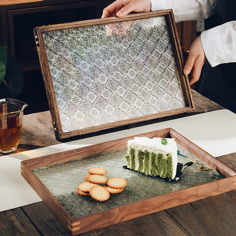 木製トレー日本式透明ガラストレーレトロベゴニアエンボスガラストレー胡桃木ケヤキトレー