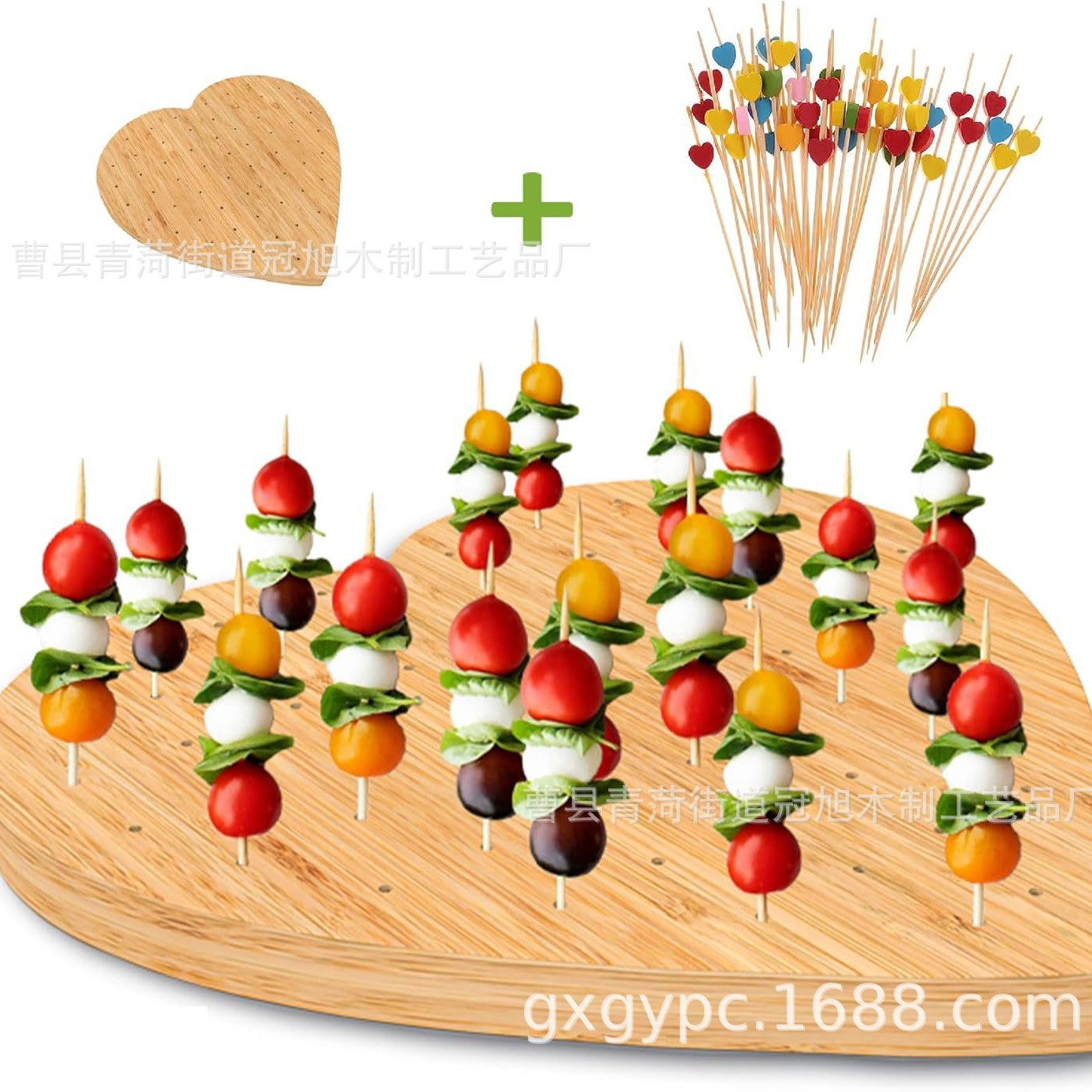 ハート型の竹製前菜串ラック、竹串付き、木製パーティーフードピックラック、裏まな板サービングトレイ