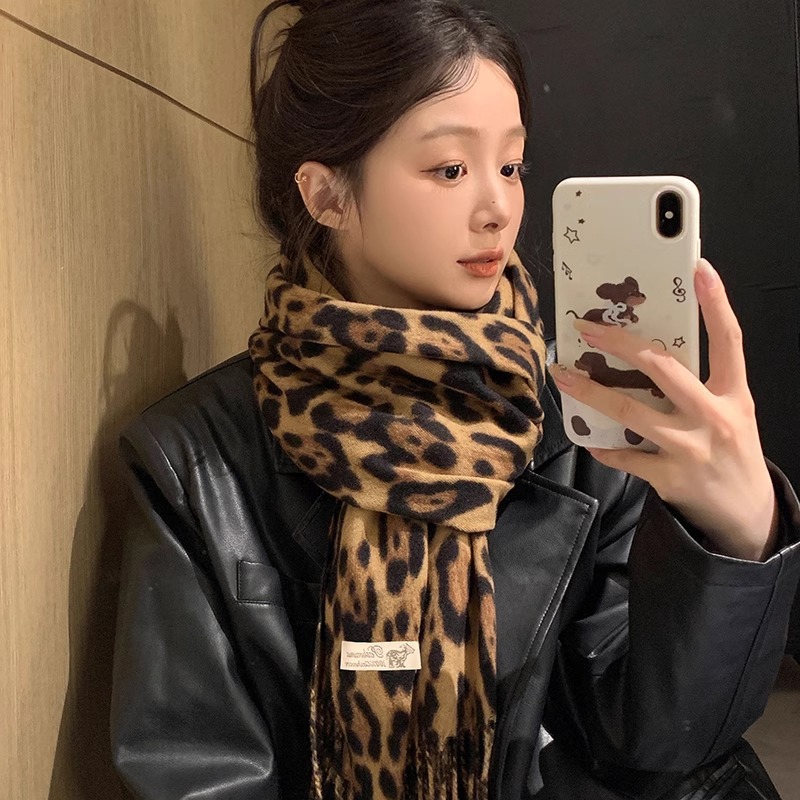 日本系レトロ豹柄マフラー女性秋冬百合ギャル甘いクール風保温マフラーファッション