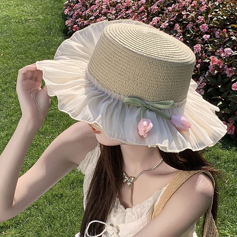 チューリップレースフラットトップ麦わら帽子女性の夏の海辺の休暇スタイルのビーチハット大きなつばの日焼け止め帽子