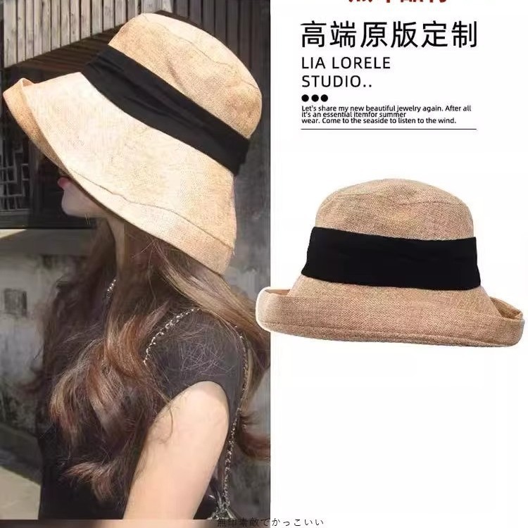 日本製リネンリボンフィッシャーマンハット女性用夏用大きなつば日焼け止め盆地帽子通気性と軽量のバックスリットサンハット
