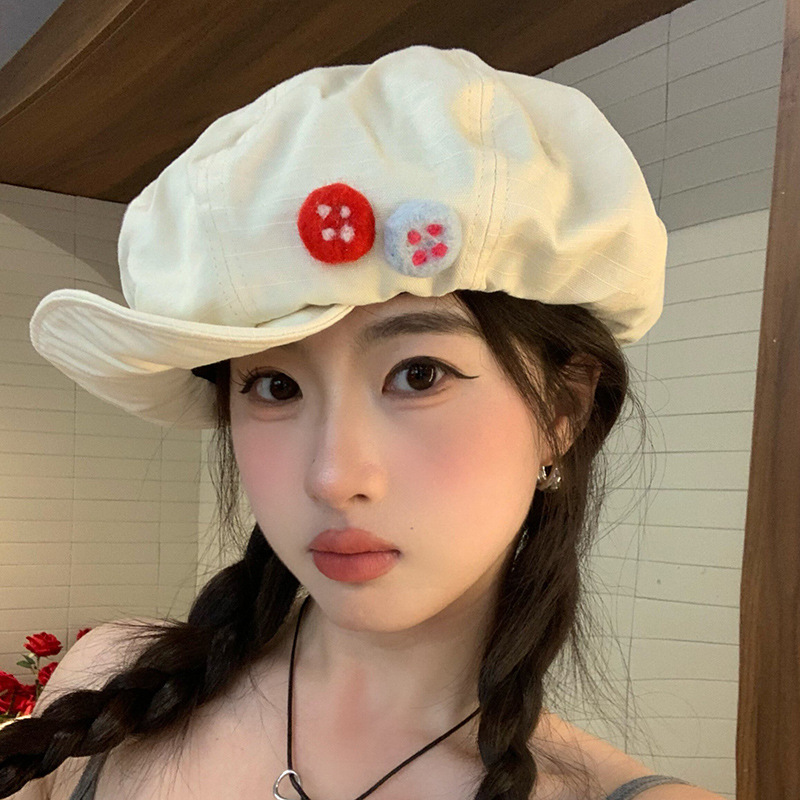 ニッチデザインレトロコットンとリネンの八角形帽子女性用日本製カラーフェルトボタンペインターハット非対称ベレー帽