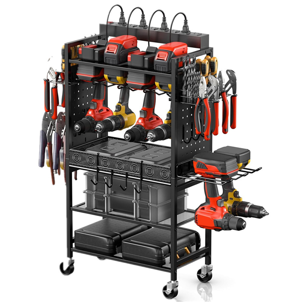 車庫作業場電動工具収納棚充電電源板付き移動可能工具車