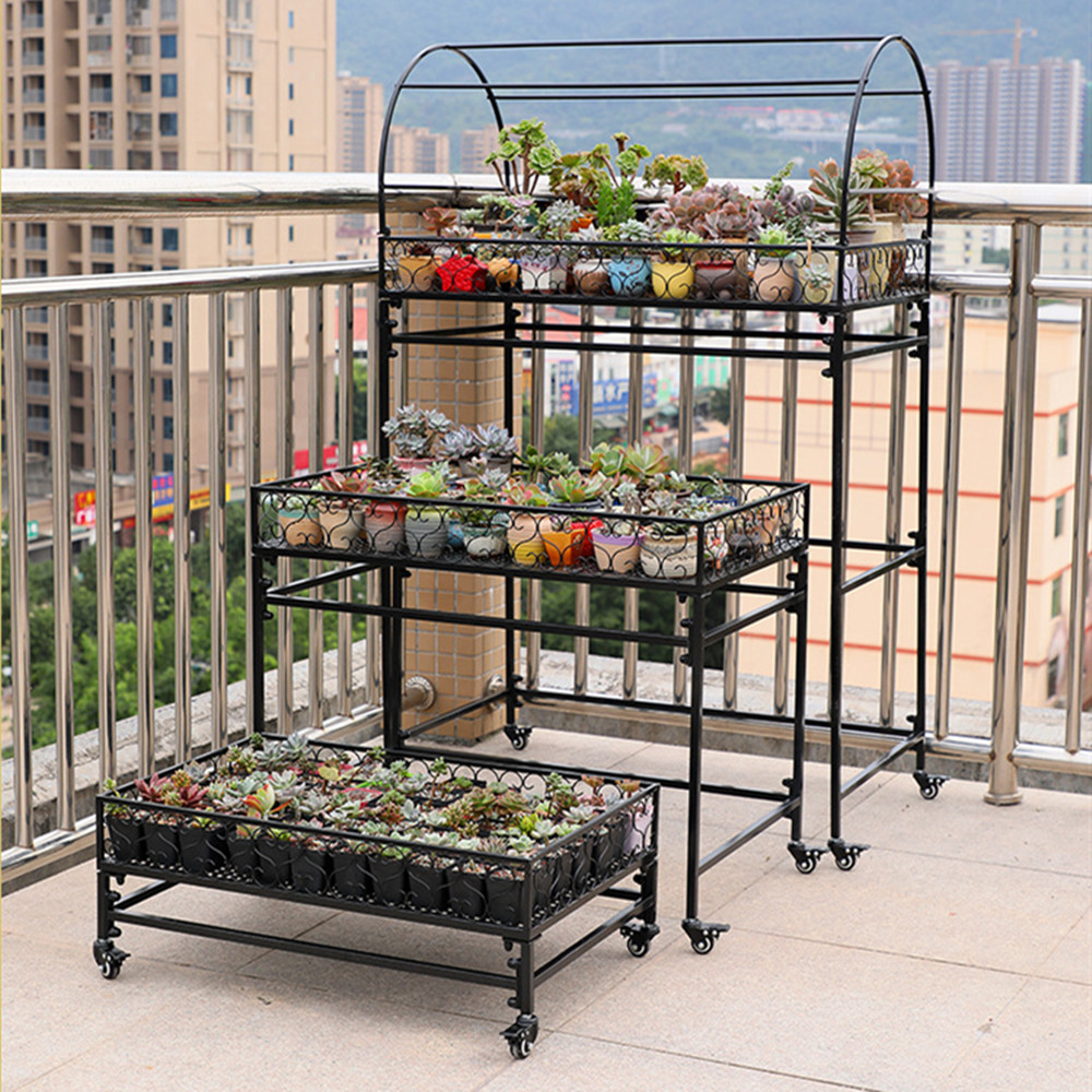 シンプルな多層鉄芸床置き式バルコニー多肉花棚輪付き移動屋外庭園カート棚