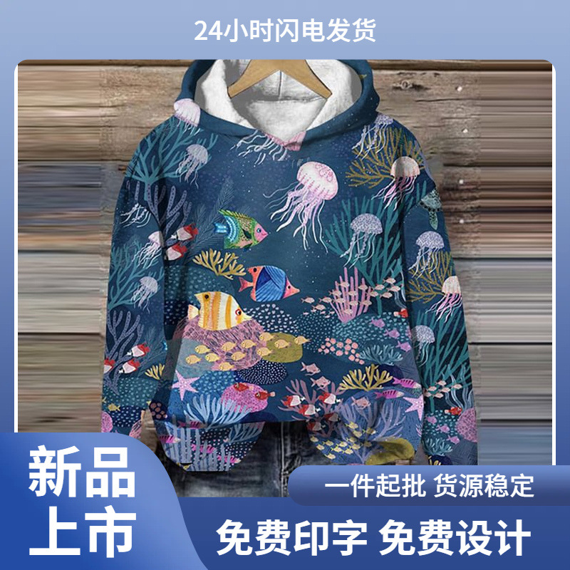 速売通欧米直販2024秋の新型帽子付き長袖ガーディアン海底生物多色芸術プリント