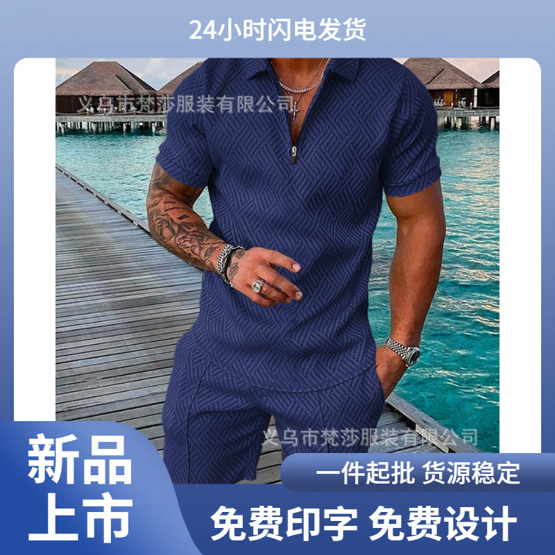 対外貿易2023国境を越えたアマゾンの起爆男性純色格子セット3dプリントファスナー半袖poloシャツ