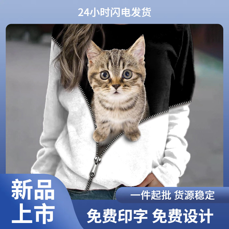 欧米のクロスボーダー新型3dデジタルプリントのファッションカジュアル丸首パーカー男女猫長袖3d