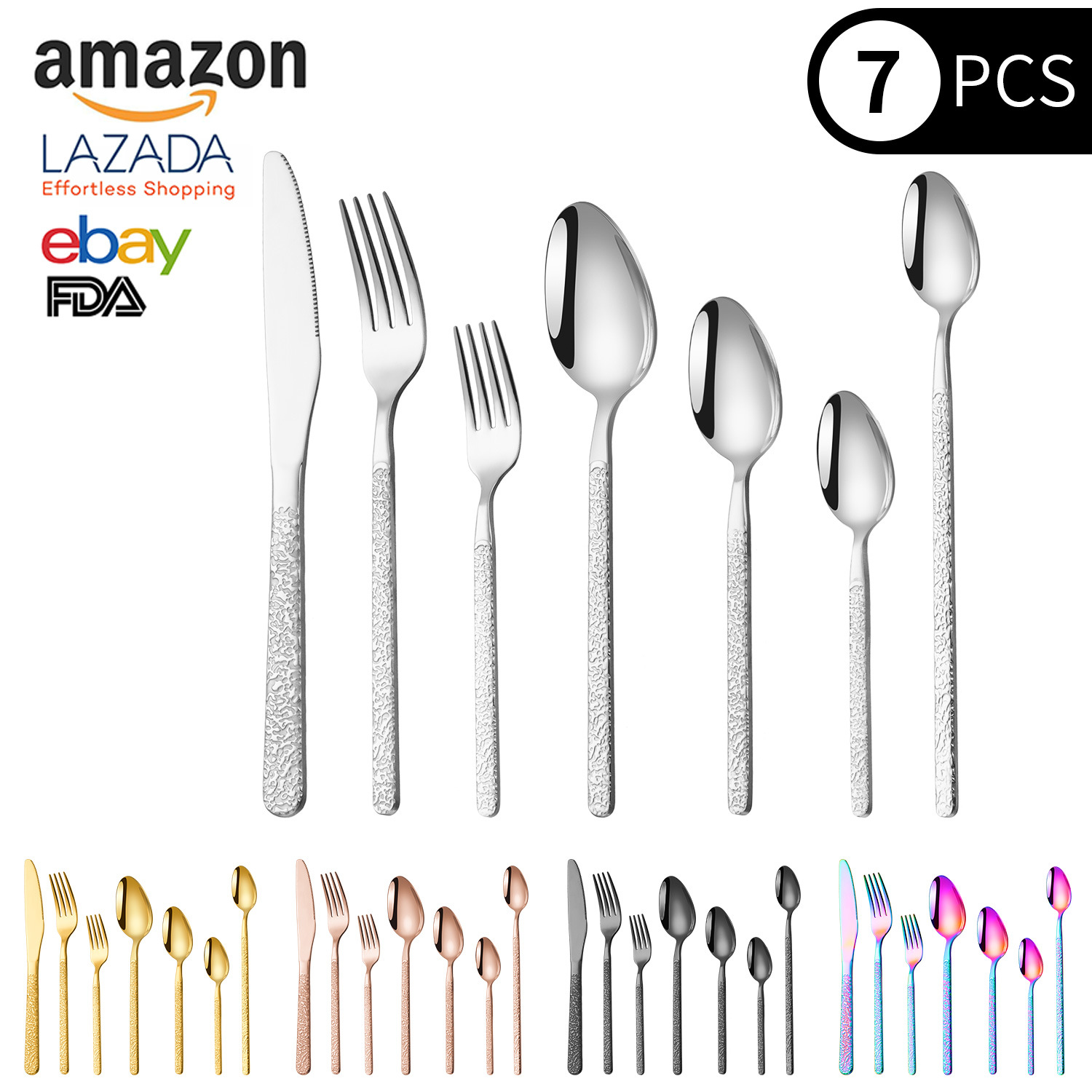 クロスボーダーステンレス鋼ストーンパターンレトロ西洋カトラリーセット 7 ピースエンボスステーキナイフディナーフォークスプーンデザートフォークスプーン