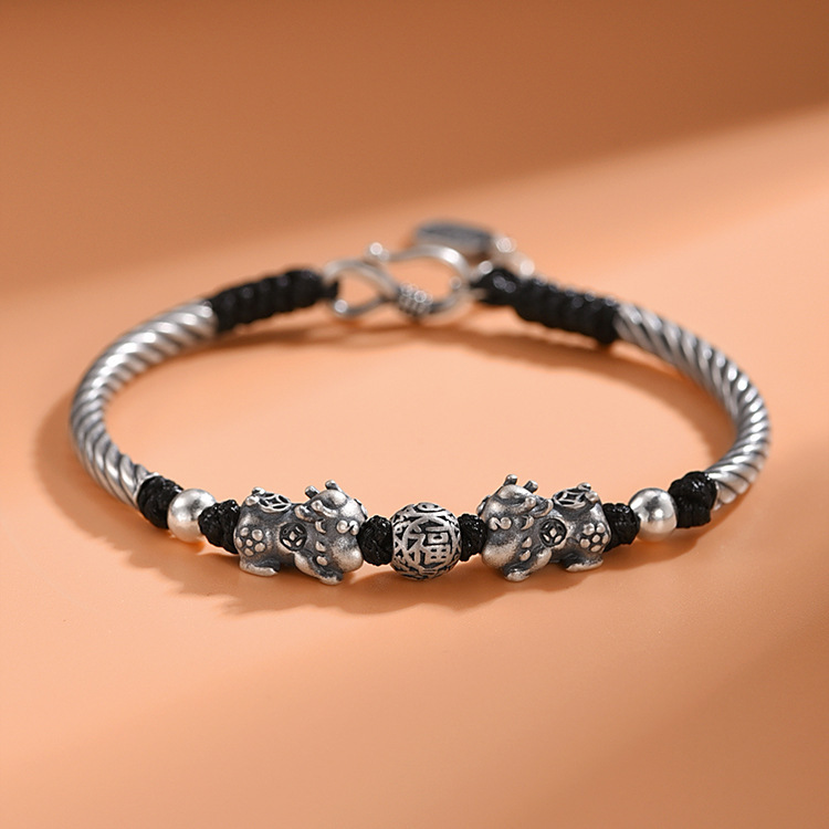999純銀のレトロなピシュピストの赤ちゃんのブレスレットの男性の潮流の民族風の手織りの手の縄の銀の装飾品