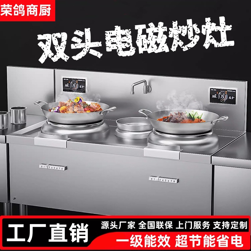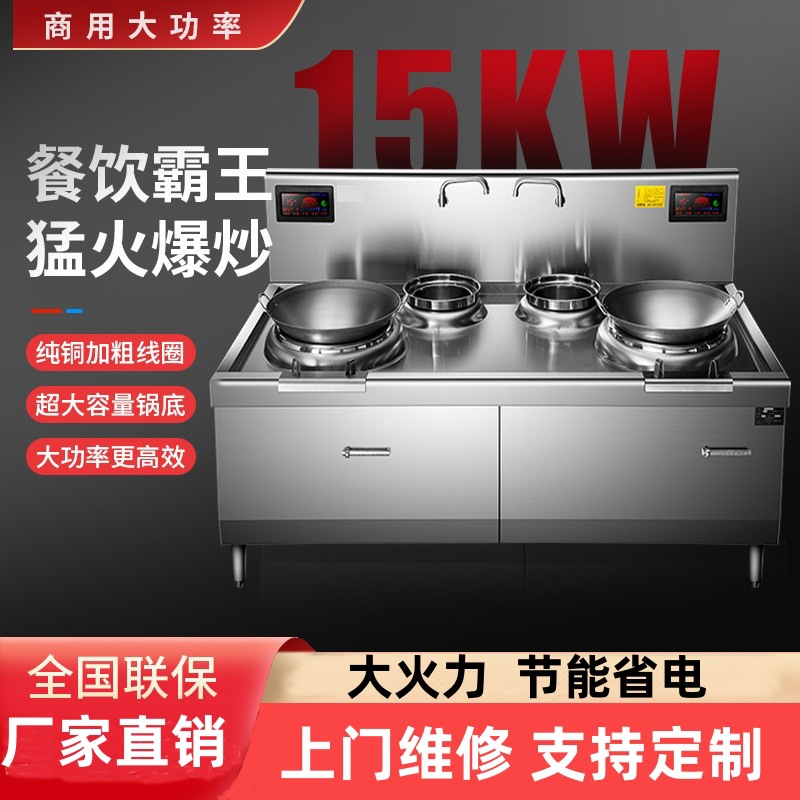業務用電磁二重ヘッド二重テール小型炒め炉15kw凹面レストランキャビネット型高出力電気炒め鍋二重コンロ電磁調理器