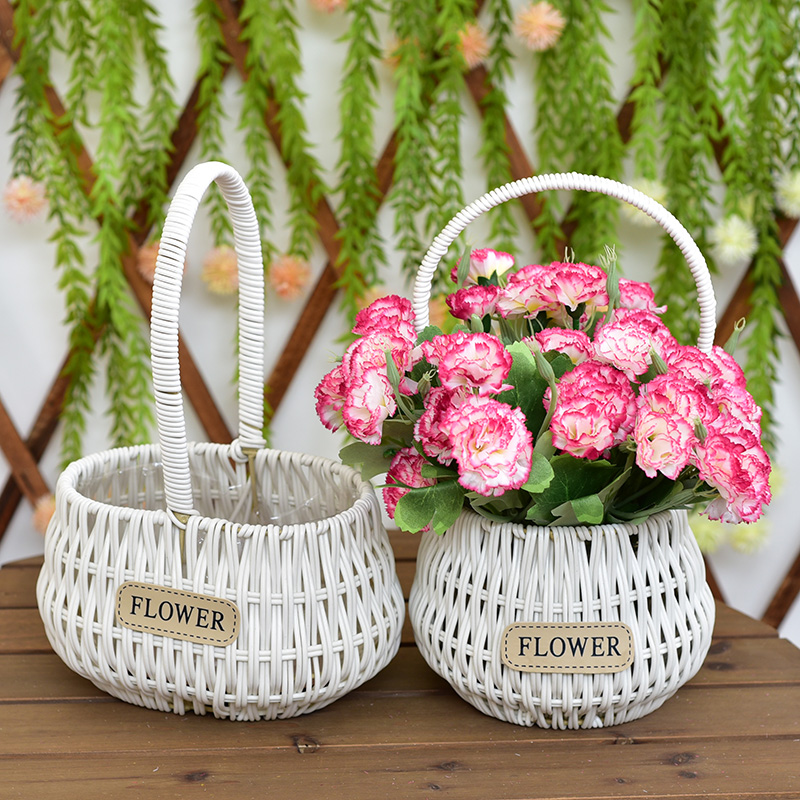 白い手提げ花かごの手作り編み物は藤のかごの装飾品を模倣します。