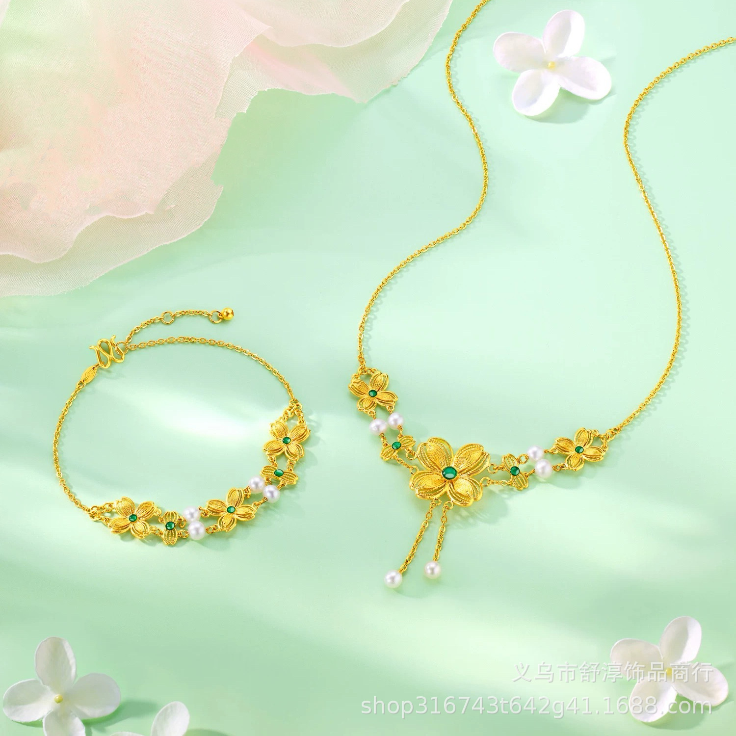 金色の花糸福満伝家の祖母緑四葉草花団の美しいネックレス