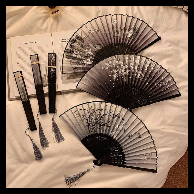 古代風の小さな扇子、中国風の男性と女性の漢服ダンス折りたたみ馬面スカート、新しい中国風の古代衣装黒竹扇子