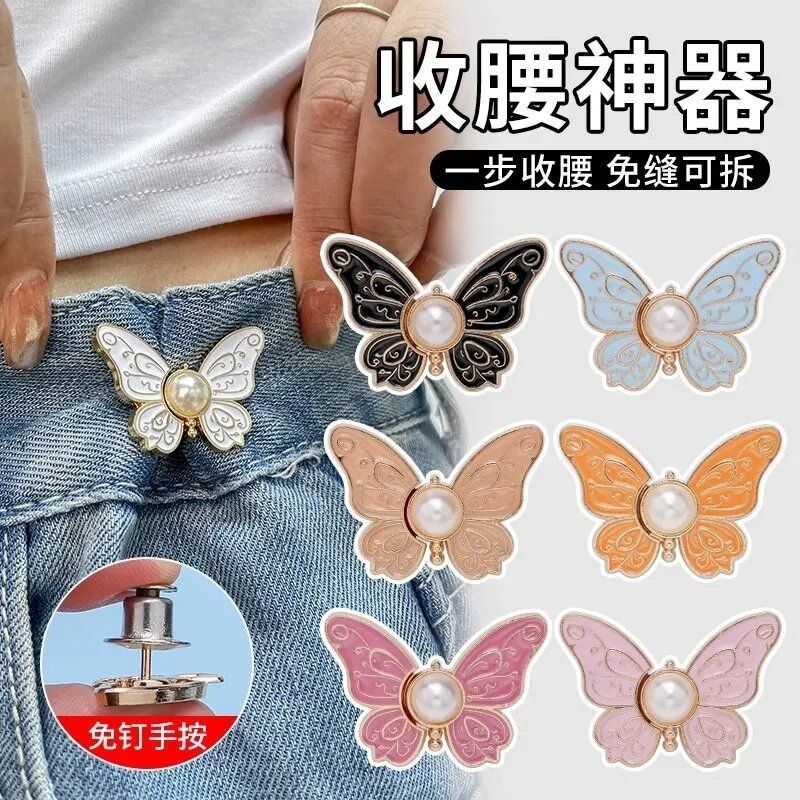 蝶は腰のボタンを締めて穴を開けないジーンズのウエストサイズを小さくして装飾の神器真珠を固定してボタンを締めます。