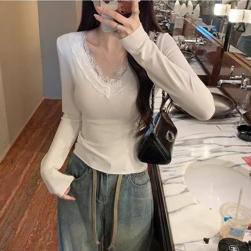 レースの縁のvネックの長袖のtシャツの女性の秋冬は毛を磨いて純粋に風を強くしたいです。