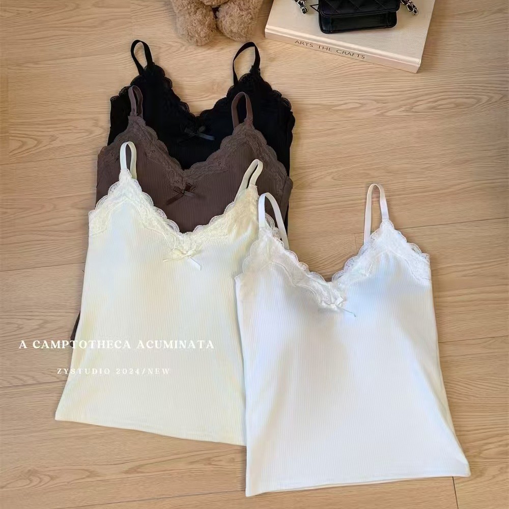厚い毛磨きギャルは胸パッド付きレースをつなぎ合わせて、vネックのストラップのベストを作ります。