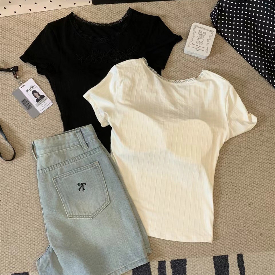 甘いギャルのレースの透かし彫りのデザイン感の蝶結びは胸のパッドの正肩の半袖のtシャツを持っています。