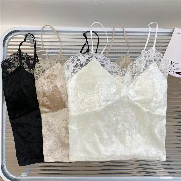 レースの金のベルベットは小さいストラップのベストの女性の胸のパッドの秋冬の新型の純粋な欲のセクシーな袖なしの底の上着をつなぎ合わせます。