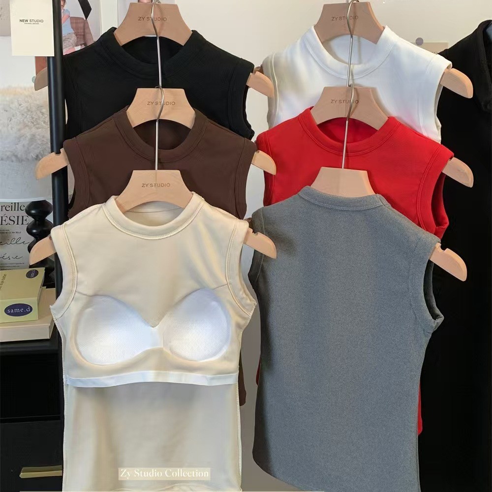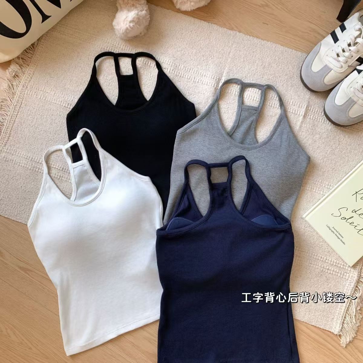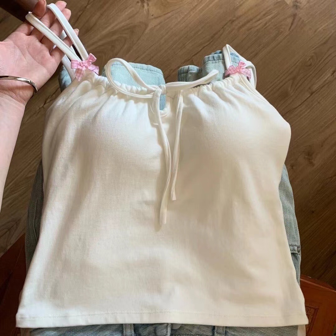 1132 # 無地ノースリーブ美背ネックレスストラップトップス 春韓国風デザイン感スリムフィット胸パッド付きトップス