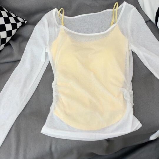ジェントルホットガール中空スーツ長袖プリーツイエローサスペンダーツーピース夏の新しい日焼け止めブラウストップ