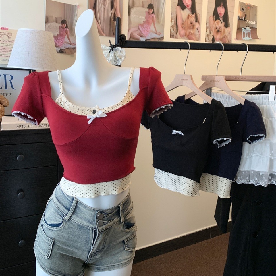 人綿2点セットフランスbm波点列ボタン角襟泡袖甘い少女蝶ネクタイ衝突色修身上着