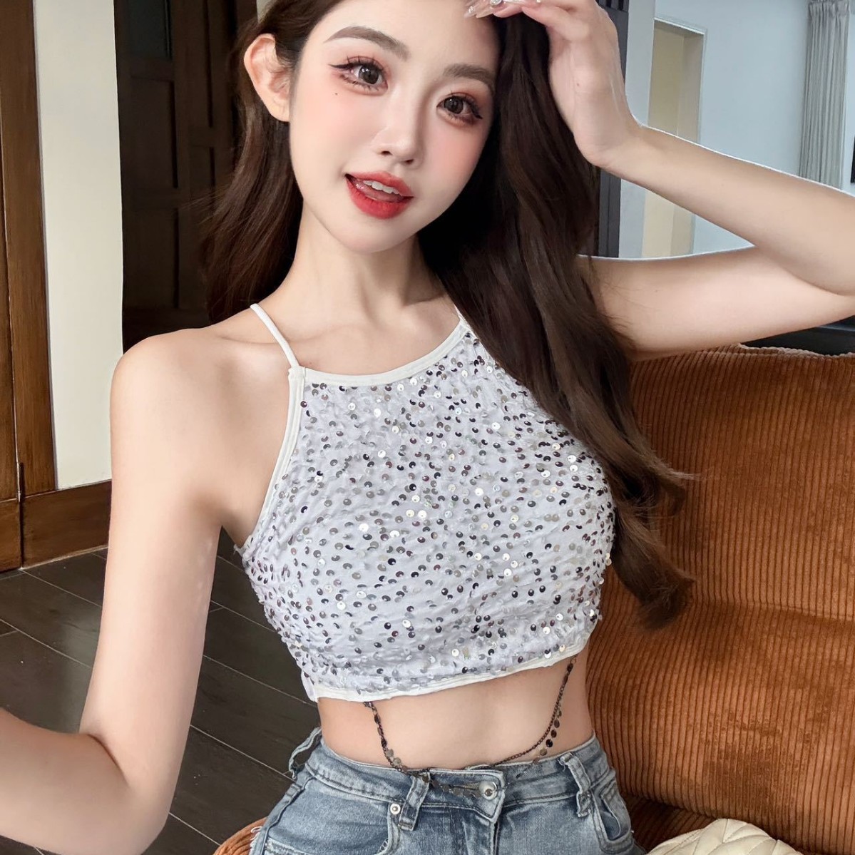 ギャル重工露背スパンコールチェーンの短い首の小さいストラップの袖なしの上着の高級感の小さいベストの女性の潮