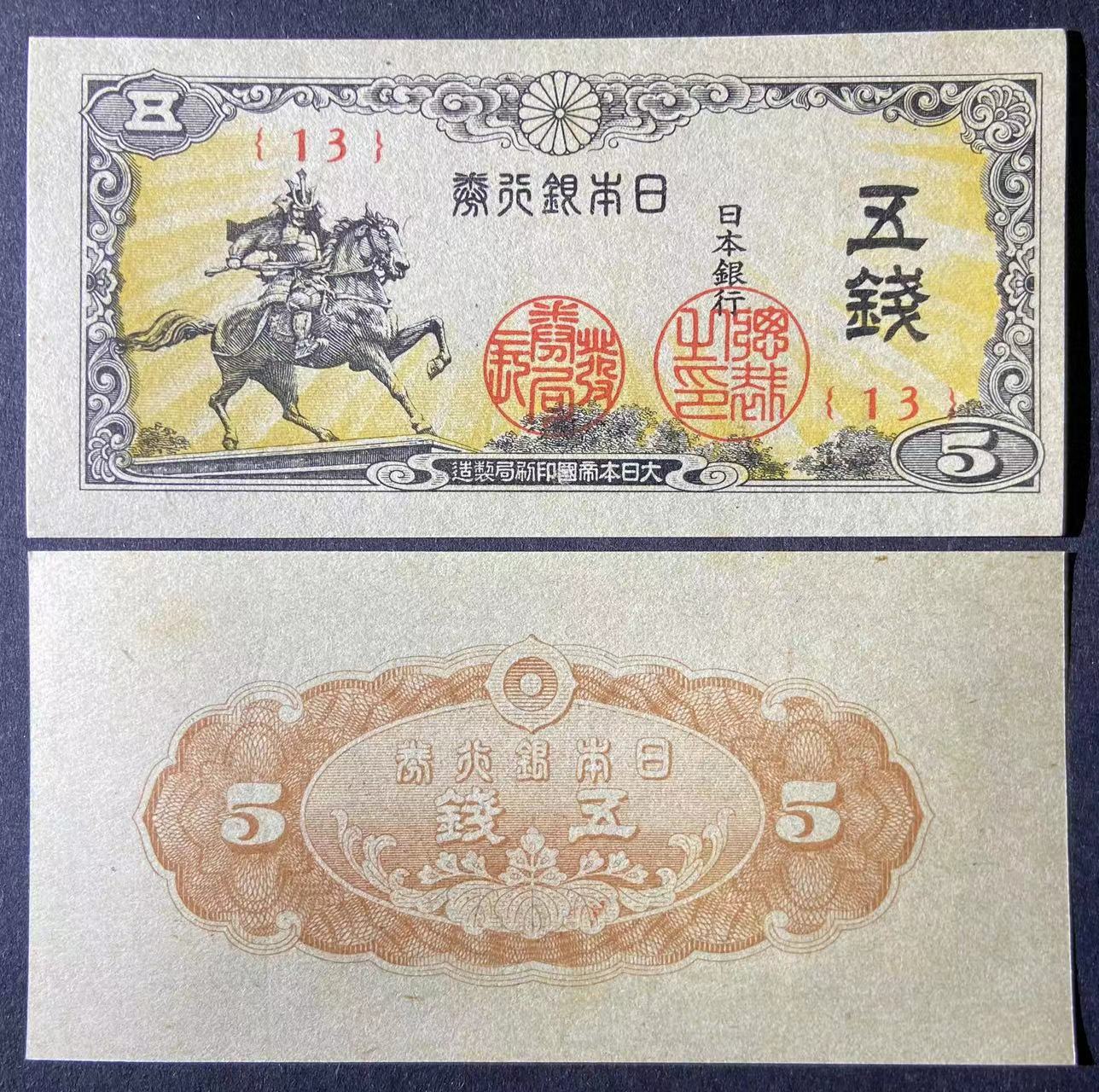 新品UNC 1944年 日本5銭紙幣 ナナキウ正成像(東京宮殿近く)P