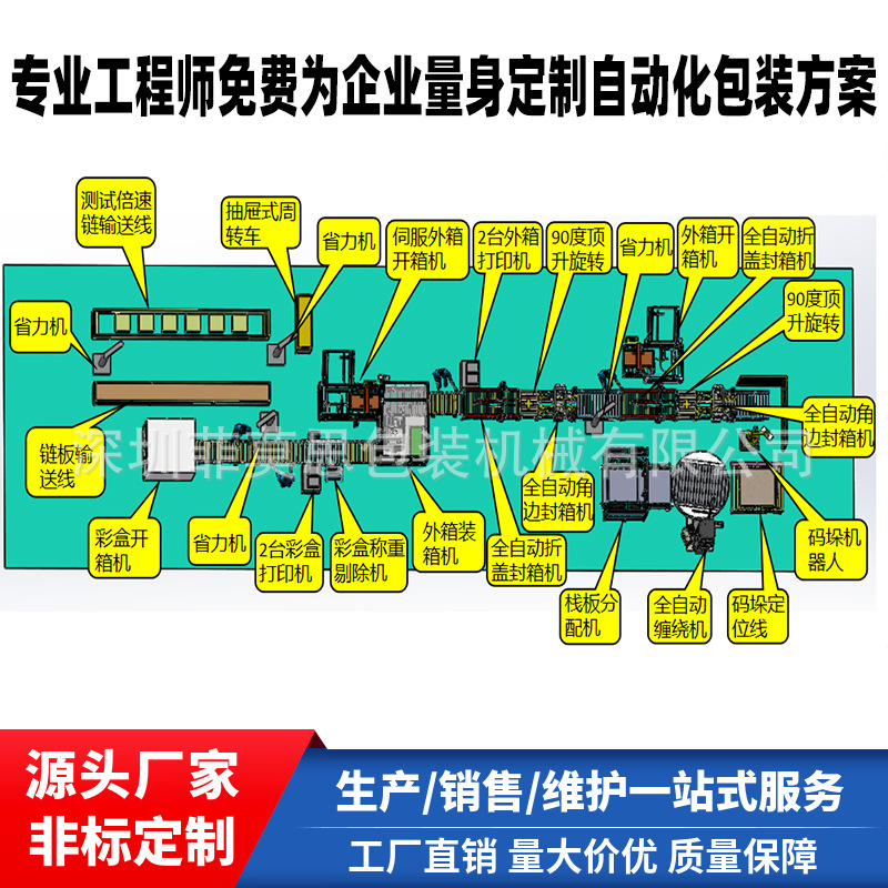 非標準包装組立ライン、自動包装生産ライン、箱開け、箱詰め、梱包、計量、包装機、カスタマイズを受け入れます