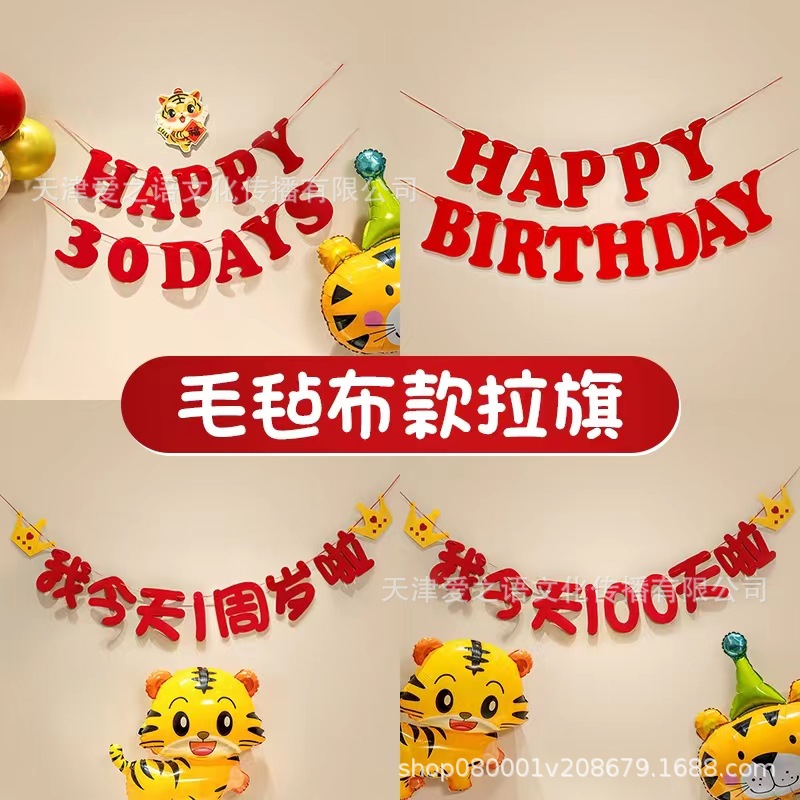 赤ちゃんの満月の百日の宴会は旗を引いて女の子の男の子の子供の歳の誕生日を飾ります。