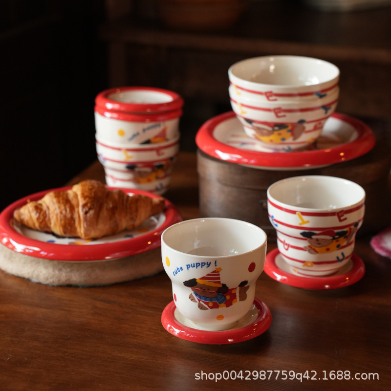 家庭用かわいいダックスフントセラミックプレート漫画セラミック皿プレート釉下色クリエイティブラウンドディスク水玉犬