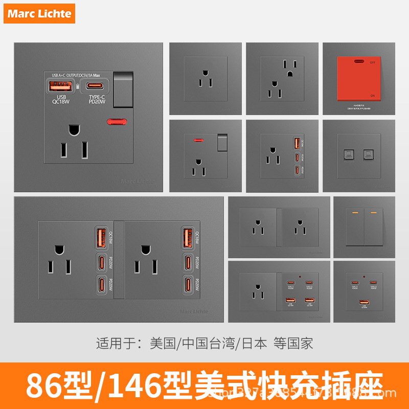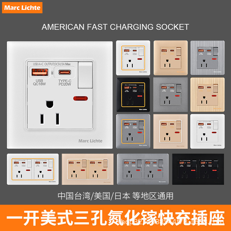 タイプ 86 アメリカ 15A 3 穴 USB + TYPE-C 急速充電 20W ソケット アメリカ 台湾 日本 146 アメリカ標準ソケット