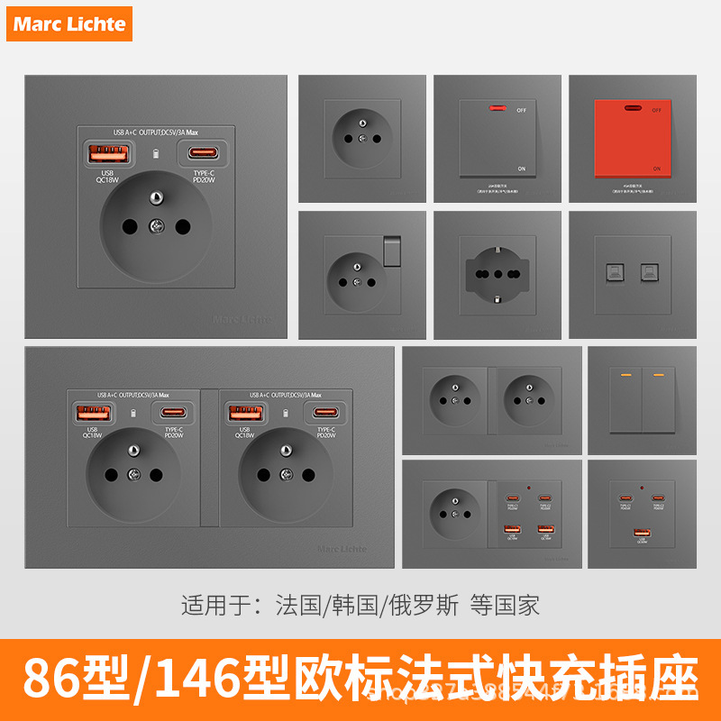 タイプ 86 16A ヨーロッパフレンチヨーロッパ標準 USB+Type-C スイッチソケット 1 オープン 2 オープングレー フランス標準電源プラグ