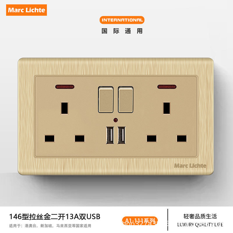タイプ 146 ブラッシュゴールド多機能 13A 角型 6 穴 3 プラグ パネル 2 オープン英国デュアル USB 香港英国ソケット