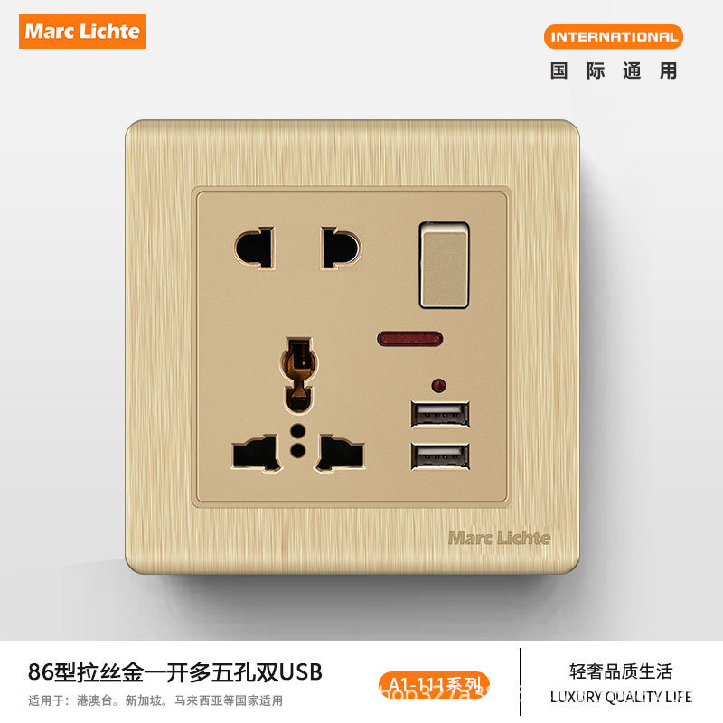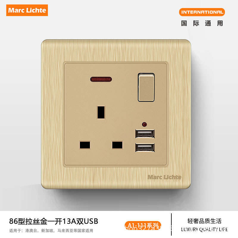 タイプ 86 13A 英国標準シャンパンゴールドつや消し USB ライト高級ソケット香港およびオーストラリアの電気スイッチ英国プラグ