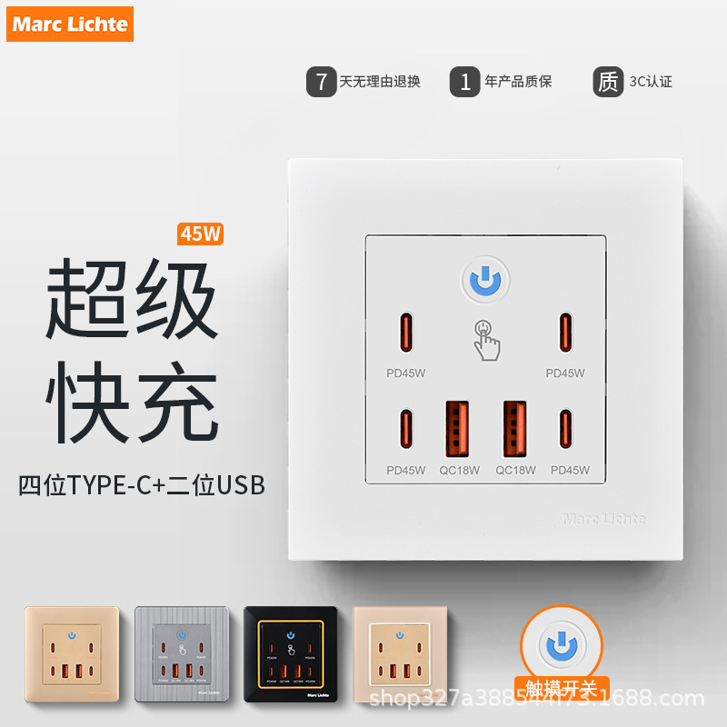 86型45W六位带触摸氮化镓超级快充220V墙壁插座充电USB插座面板