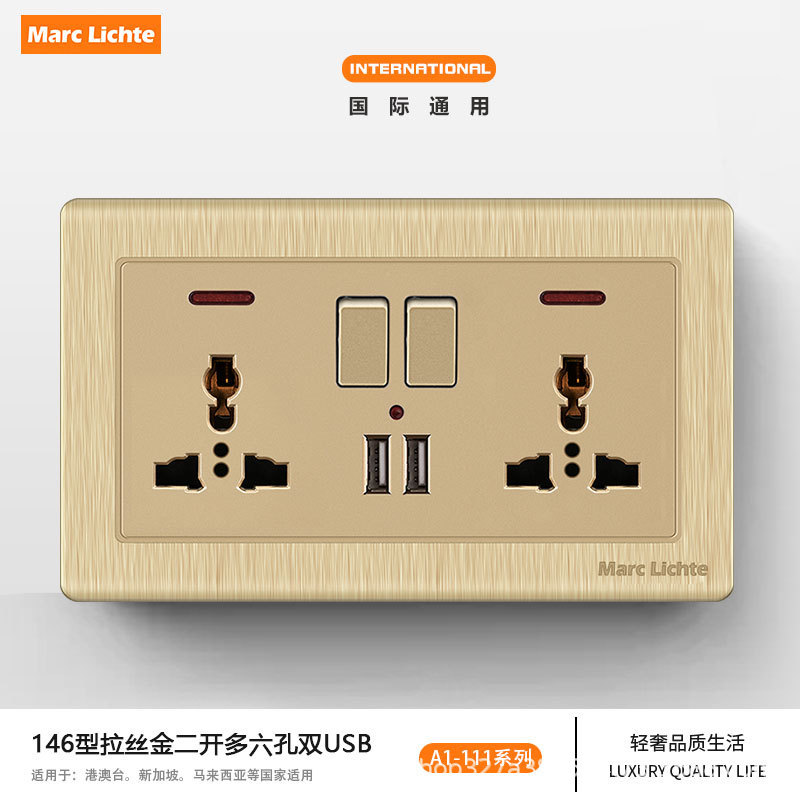 タイプ 146 香港 13a 英国標準 2 オープン 6 穴ソケット スイッチ付き 6 穴 USB ブラッシュゴールド キッチン 英国ソケット