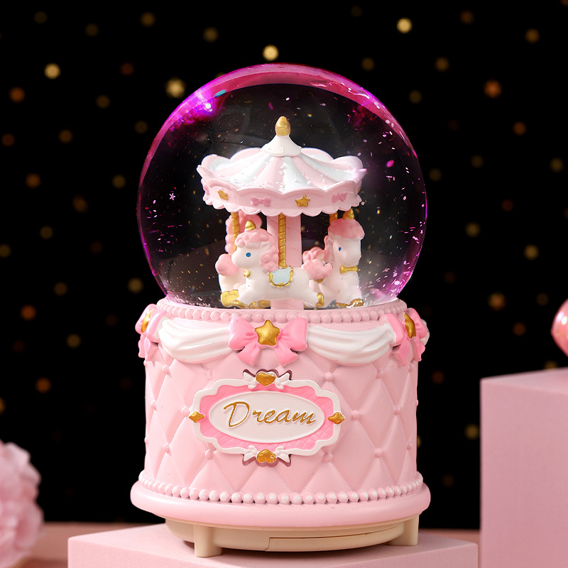 夢幻の雪のオルゴールの回転の木馬の水晶のボールは女子学生の誕生日のプレゼントの創意の贈り物のオルゴールの置物を送ります。