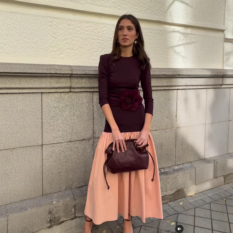 国境を越えた街頭では、新しい色合わせの7分袖のスリムなワンピースファッション的な雰囲気のデザイン感のあるロングスカートを撮影しています