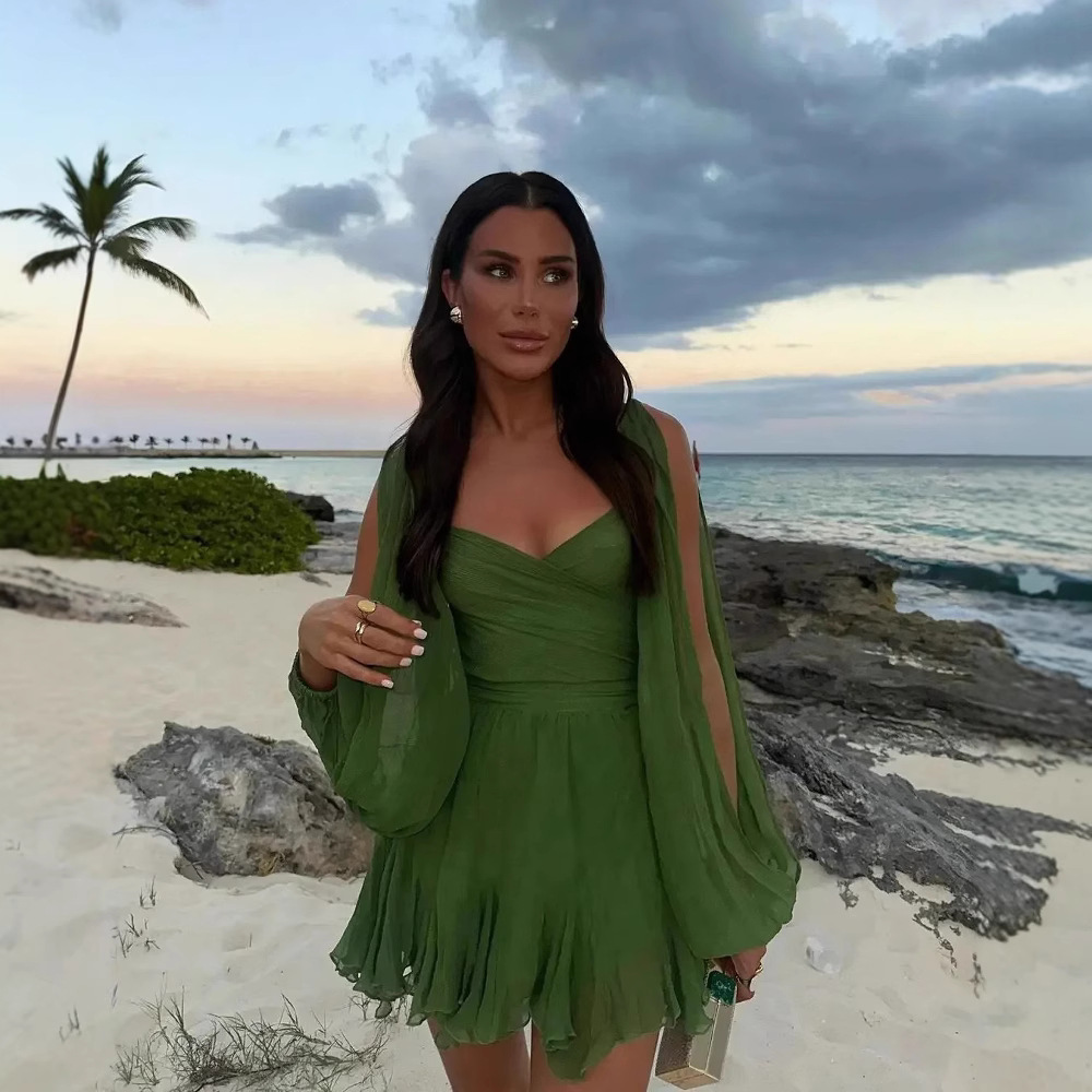 2025クロスボーダー卸売り夏欧米女装新vネック長袖抜き背抜きミニデザイン感ワンピース