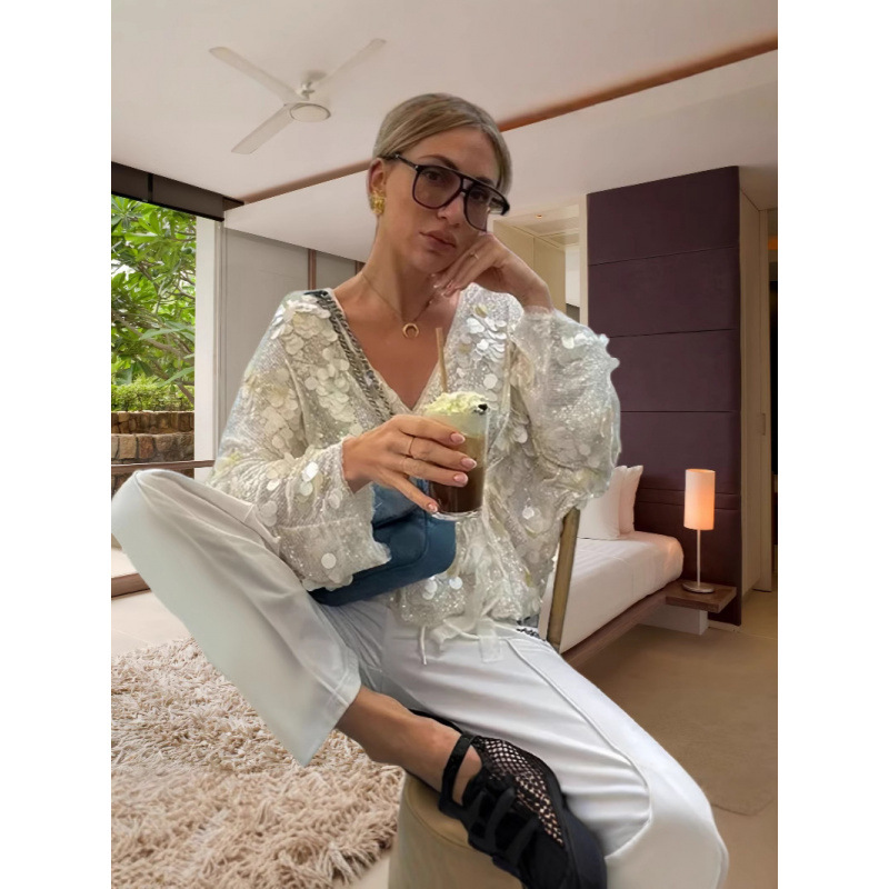 2025欧米の街頭の潮流の純色のビーズの長袖のtシャツの女性の新型の個性のvネックの長袖のカジュアルでゆったりしている上着